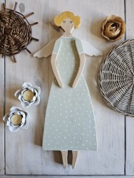 Velká dřevěná andělka, blond vlásky, světle zelené šaty s puntíky