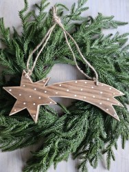 Dřevěná závěsná kometa je z masivního dřeva, vhodný k dekoraci do interiéru i exteriéru. Venku je ovšem nutné počítat s tím, že díky povětrnostním vlivům přidá postupem času patina dřeva na intenzitě, jak už to u dřeva venku bývá. Cena je za 1 kus.