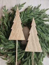 Dřevěný zápich ve tvaru stromečku je z masivního dřeva, vhodný k dekoraci do interiéru i exteriéru. Venku je ovšem nutné počítat s tím, že díky povětrnostním vlivům přidá postupem času patina dřeva na intenzitě, jak už to u dřeva venku bývá. Cena je za 1 kus.