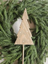 Dřevěný zápich ve tvaru stromečku je z masivního dřeva, vhodný k dekoraci do interiéru i exteriéru. Venku je ovšem nutné počítat s tím, že díky povětrnostním vlivům přidá postupem času patina dřeva na intenzitě, jak už to u dřeva venku bývá. Cena je za 1 kus.