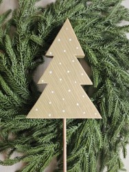 Dřevěný zápich ve tvaru stromečku je z masivního dřeva, vhodný k dekoraci do interiéru i exteriéru. Venku je ovšem nutné počítat s tím, že díky povětrnostním vlivům přidá postupem času patina dřeva na intenzitě, jak už to u dřeva venku bývá. Cena je za 1 kus.