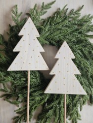 Dřevěný zápich ve tvaru stromečku je z masivního dřeva, vhodný k dekoraci do interiéru i exteriéru. Venku je ovšem nutné počítat s tím, že díky povětrnostním vlivům přidá postupem času patina dřeva na intenzitě, jak už to u dřeva venku bývá. Cena je za 1 kus.