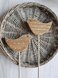 Dřevěný zápich ve tvaru ptáčka je z masivního dřeva, vhodný k dekoraci do interiéru i exteriéru. Venku je ovšem nutné počítat s tím, že díky povětrnostním vlivům přidá postupem času patina dřeva na intenzitě, jak už to u dřeva venku bývá.