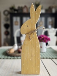 Zajíček je z masivního dřeva s patinou, k postavení, ručně dělaný se srdcem a láskou, co kus, to originál. Je vhodný k dekoraci do interiéru i exteriéru. Venku je ovšem nutné počítat s tím, že díky povětrnostním vlivům přidá postupem času patina dřeva na intenzitě, jak už to u dřeva venku bývá.