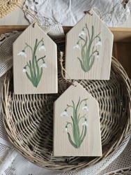 Dřevěný závěsný domeček se sněženkami šedobílý