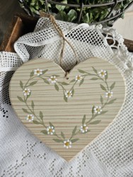 Závěsné dřevěné srdíčko s věnečkem zelenkavé, bílé kytičky
