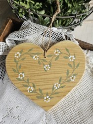 Závěsné dřevěné srdíčko s věnečkem žluté, bílé kytičky