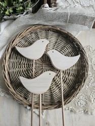 Dřevěný zápich ve tvaru ptáčka je z masivního dřeva, vhodný k dekoraci do interiéru i exteriéru. Venku je ovšem nutné počítat s tím, že díky povětrnostním vlivům přidá postupem času patina dřeva na intenzitě, jak už to u dřeva venku bývá.