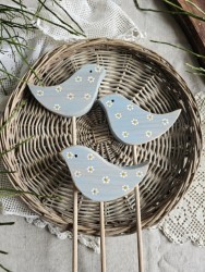 Dřevěný zápich ptáček modrý s kytičkami